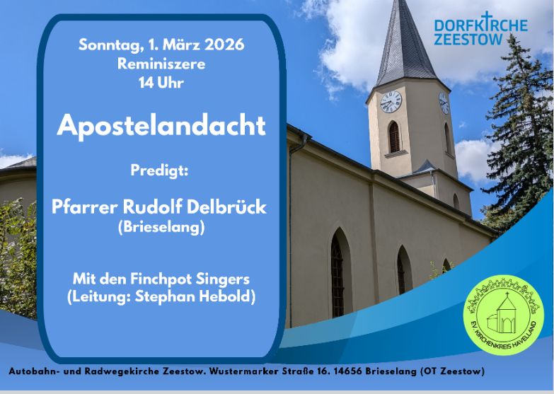 Reminiszere 14:00 Uhr in der in der Autobahn- und Radwegekirche Zeestow Pfarrer Rudolf Delbrück (Ev. Trinitatisgesamtkirchengemeinde Brieselang) mit dem Kreisgospelchor Finchpotsingers